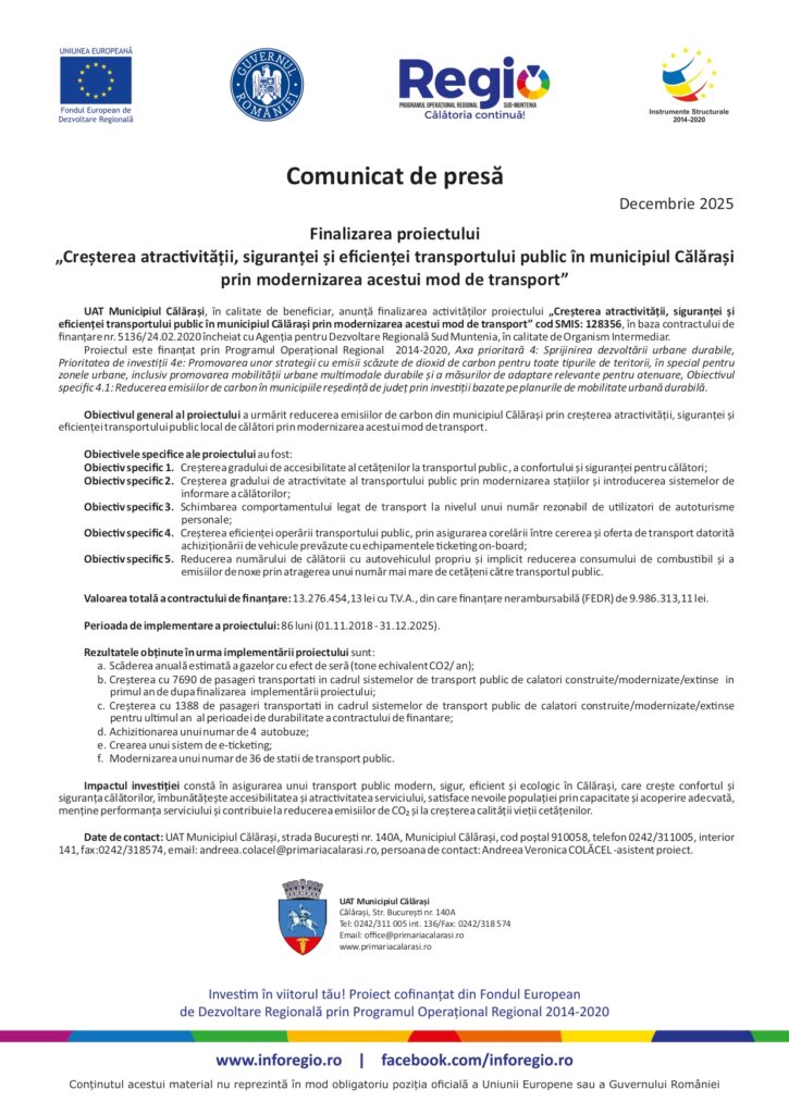 NATIONAL Finalizarea proiectului „Creșterea atracvității, siguranței și eficienței transportului public în municipiul Călărași prin modernizarea acestui mod de transport” December 13, 2025