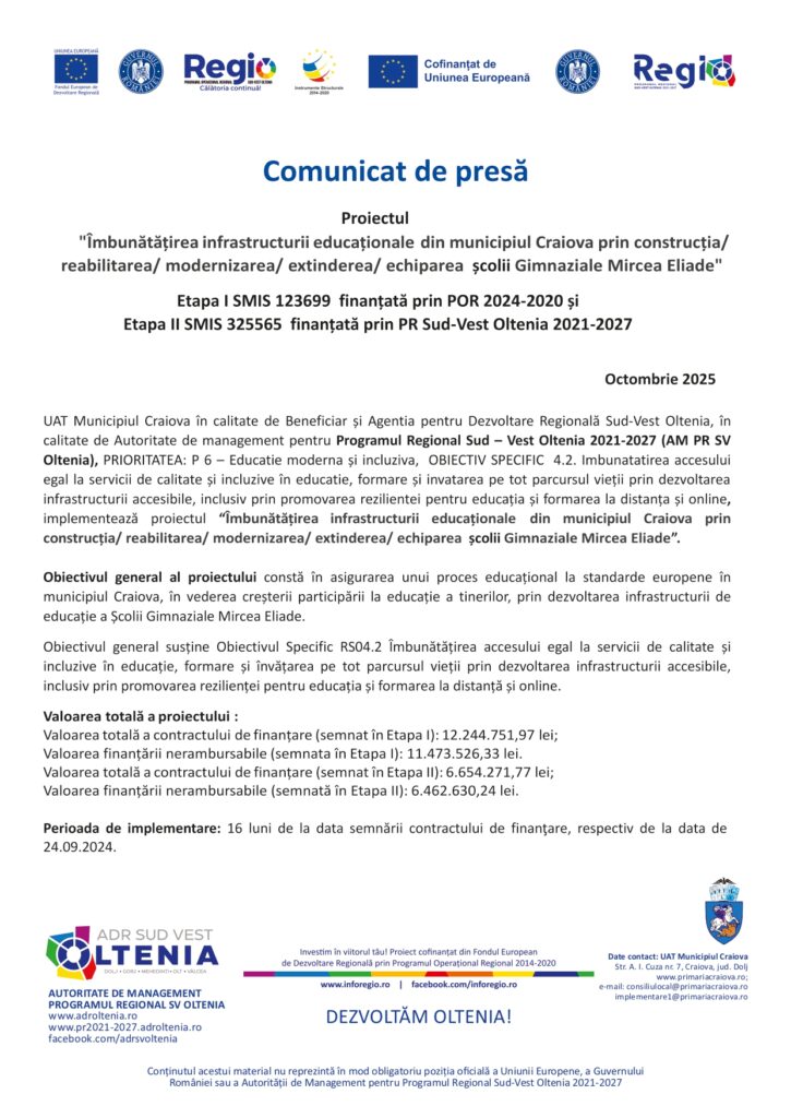 NATIONAL Îmbunătățirea infrastructurii educaționale din municipiul Craiova prin construcția/ reabilitarea/ modernizarea/ extinderea/ echiparea școlii Gimnaziale Mircea Eliade October 11, 2025