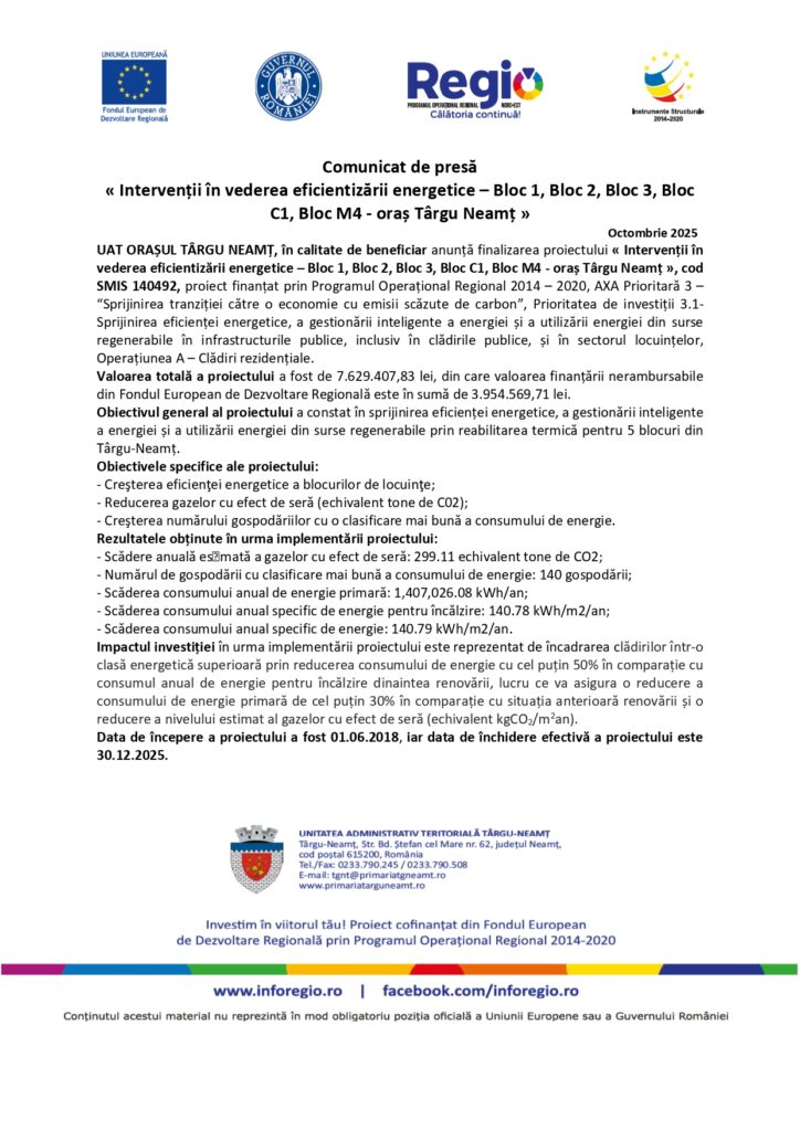 NATIONAL Intervenții în vederea eficientizării energetice – Bloc 1, Bloc 2, Bloc 3, Bloc C1, Bloc M4 – oraș Târgu Neamț October 28, 2025