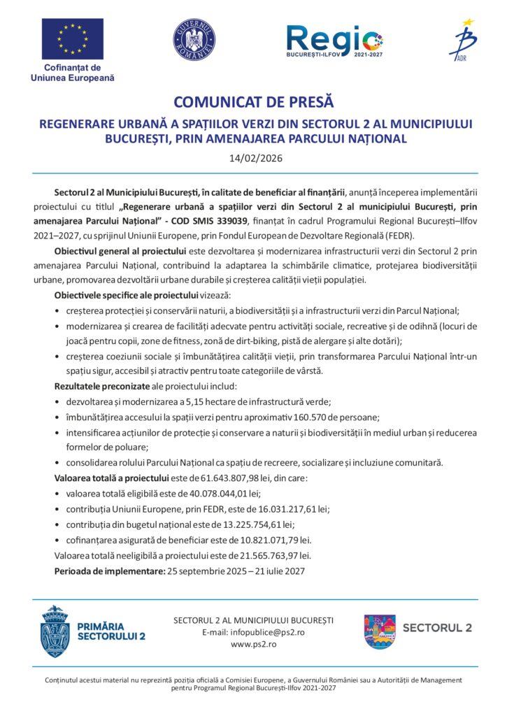 NATIONAL Regenerare urbană a spațiilor verzi din Sectorul 2 al municipiului București, prin amenajarea Parcului Național February 15, 2026