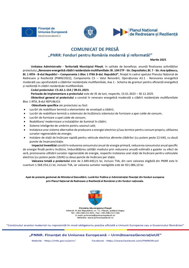 NATIONAL Renovare energetică clădiri rezidențiale multifamiliale: Bl. 104 ETP – Str. Depozitelor, Bl. 7 – Str. Ana Ipătescu, Bl. 1 IRTA – B-dul Republici – Componenta 1 Bloc 1 ITRA B-dul. Republicii October 7, 2025